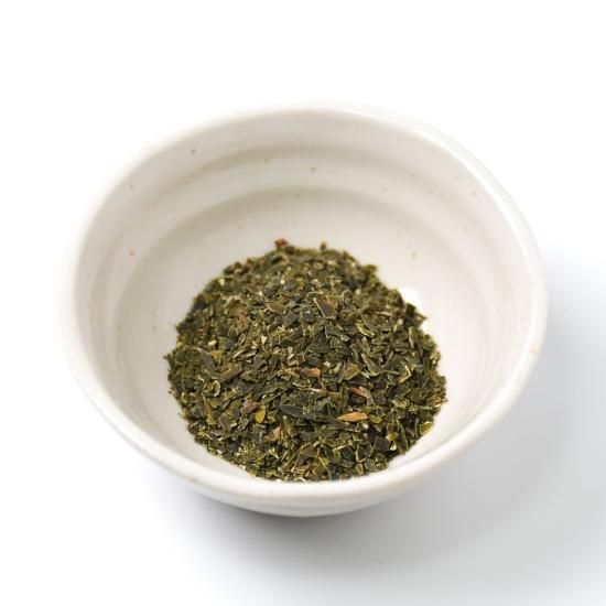十分に天日干した後、不要な端葉等を取り除き、晴天で湿度が低い日を見計らい、昔ながらの臼と杵を用いて叩き、荒めの粉末粒にしたものを篩に掛けて調製した、無添加の製品です。